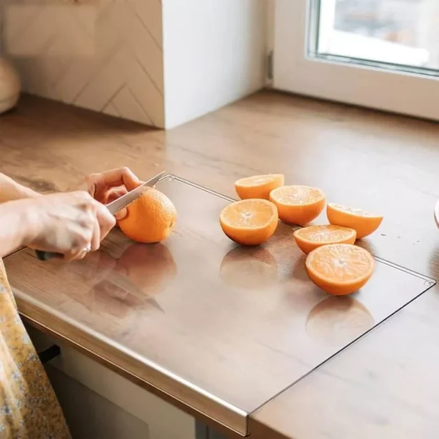 This cutting board is not just a utility item but a statement of style. Its transparent design ensures it never detracts from the beauty of your countertops, complementing a variety of home aesthetics. Plus, its robust construction balances durability with lightweight ease, making it a long-lasting addition to your kitchen arsenal.