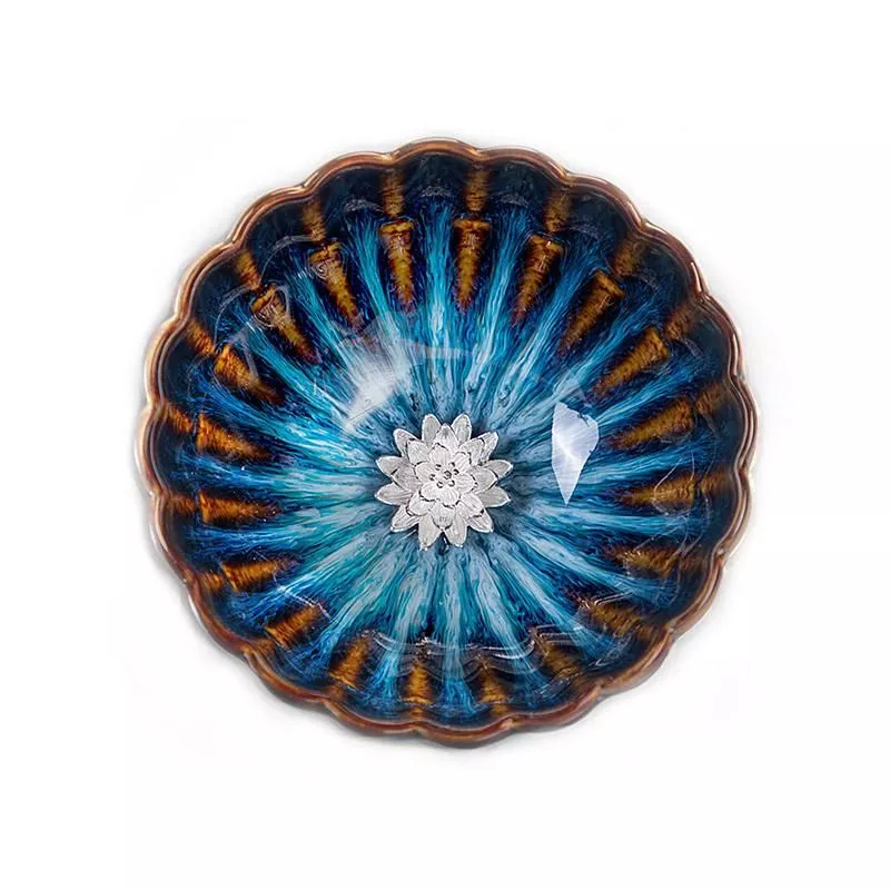 I've been using this cup nearly every day for the past year, and I'm just as enchanted by it now as I was when I first received it. It's incredibly stunning. This cup is fully vitrified and won't impart the same taste-enhancing qualities as unsealed Jianzhan cups, so if you prefer a more neutral taste, this is an excellent choice. The craftsmanship is exceptional - this cup is flawless, as are all the cups I've acquired from Tenmokus so far. It's worth mentioning that tea oils gradually coat the surface of the silver lotus blossom, giving it a beautifully rich golden hue over time. Cleaning this cup has never been an issue - the lotus blossom rarely traps tiny tea particles underneath, and when it does, they are easily rinsed away with cold water